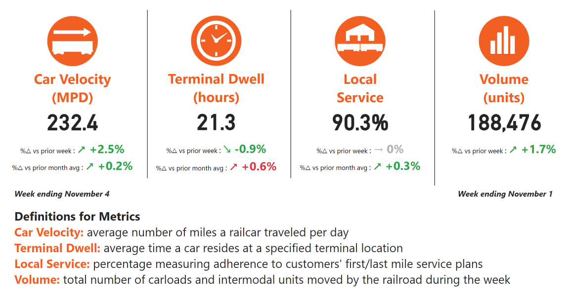 BNSF operating teams are sustaining improved service performance as we move through the first week of November. Car velocity has increased compared to the previous week and is steady with the average for the month of October. Average terminal dwell remains consistent with that of the previous week and month, and our local service compliance measure exceeds 90 percent.