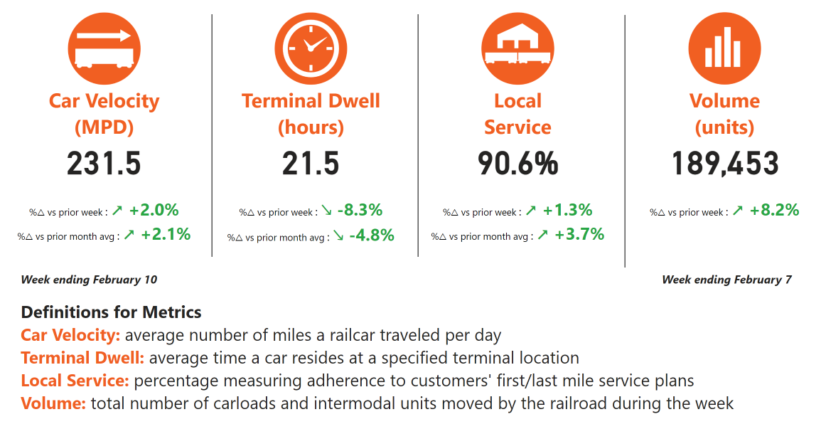 The BNSF network is in solid condition, with service performance continuing to strengthen following January’s winter weather. As we move further into February, key operating metrics are trending positively. Average car velocity has increased 2% compared to both last week and last month. Terminal dwell has improved by more than 8% week over week and nearly 5% month over month. Additionally, local service compliance has strengthened and now exceeds 90%.