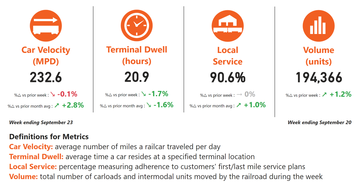 Overall car velocity was essentially unchanged versus the prior week, and it is nearly 3% higher than the average level for August. Average terminal dwell improved compared to the previous week and month. Additionally, our local service compliance metric remains consistently above 90 percent.