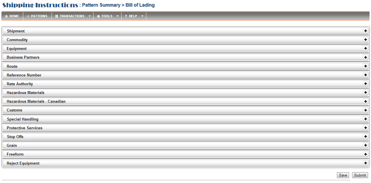 Below is a view of the Bill of Lading screen with each of the panels collapsed.