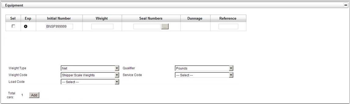 The equipment panel is for entering your equipment initial and number. You can also record seal numbers, dunnage numbers, and reference numbers. Adding additional equipment can be entered by clicking on Add.