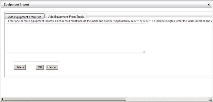Additional equipment for a single shipment can be entered on the Equipment Import popup. This information can be imported from a file or directly from a track list.