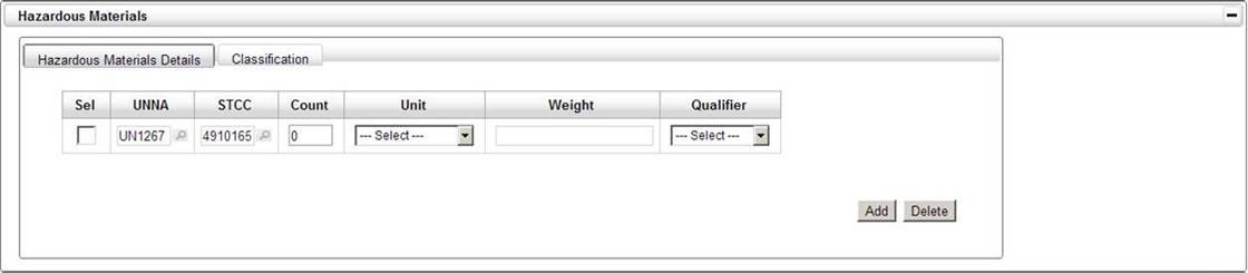 Hazardous Material commodity codes are entered in the Hazardous Materials section. This is information specific to the hazardous materials being shipped.
