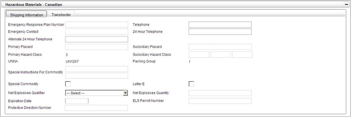 The Hazardous Materials Canadian panel is where hazardous material handling information specific for shipments moving into or out of Canada should be entered.