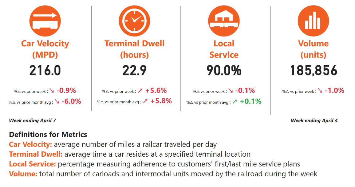 At the network level, overall service metrics reflect these events, with early signs of improvement in recent days. Average car velocity softened modestly week over week and remains below recent monthly levels. Terminal dwell was elevated compared to recent averages, while local service performance remained consistent with recent trends, averaging 90%.