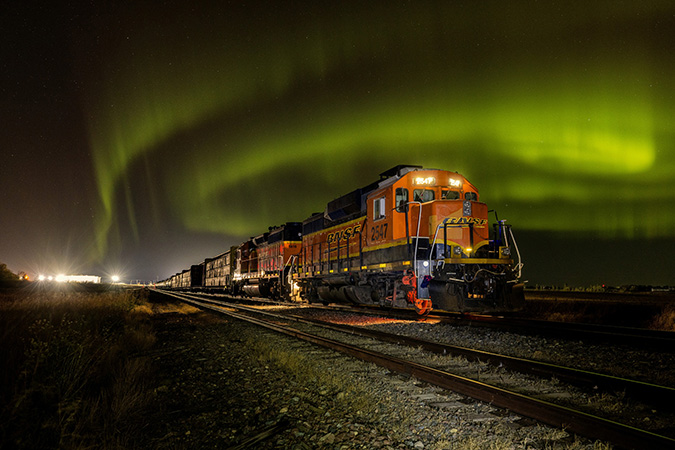 A BNSF train stands illuminated beneath the vibrant Northern Lights on a quiet night in Berthold, North Dakota.