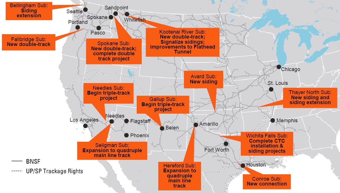 BNSF’s 2018 capital expenditure plan of approximately $3.3 billion reflects BNSF’s continued focus on maintaining a strong, fluid network that allows us to meet changing customer demands. Since 2000, BNSF has invested more than $60 billion in our network – all while remaining focused on our commitment to safety, maximizing efficiency, and continuing to meet our customers’ expectations. The largest component of the 2018 plan will be to replace and maintain BNSF’s core network to ensure trains can run safely and limit the need for unscheduled service outages that can slow down the rail network and reduce capacity. It will include approximately 13,000 miles of track surfacing and/or undercutting work, as well as the replacement of more than 500 miles of rail and nearly 3 million rail ties. There are currently more than 35 capital gangs in full operation across BNSF. As part of the customer tools described above, BNSF provides weekly Track Maintenance postings with detailed information and maps showing the location and impact of planned maintenance.